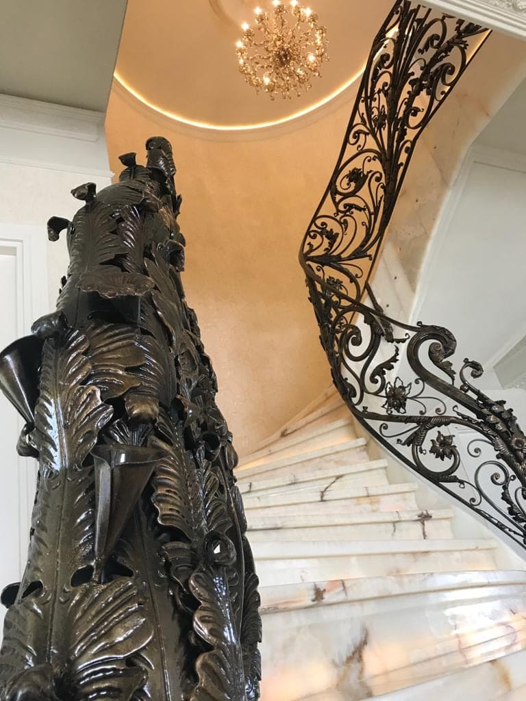 ◦ Scară este din ONIX – piatră translucidă cu iluminat bandă led – balustradă din fier forjat lucrat manual – model inspirat din palat din Sudul Franței