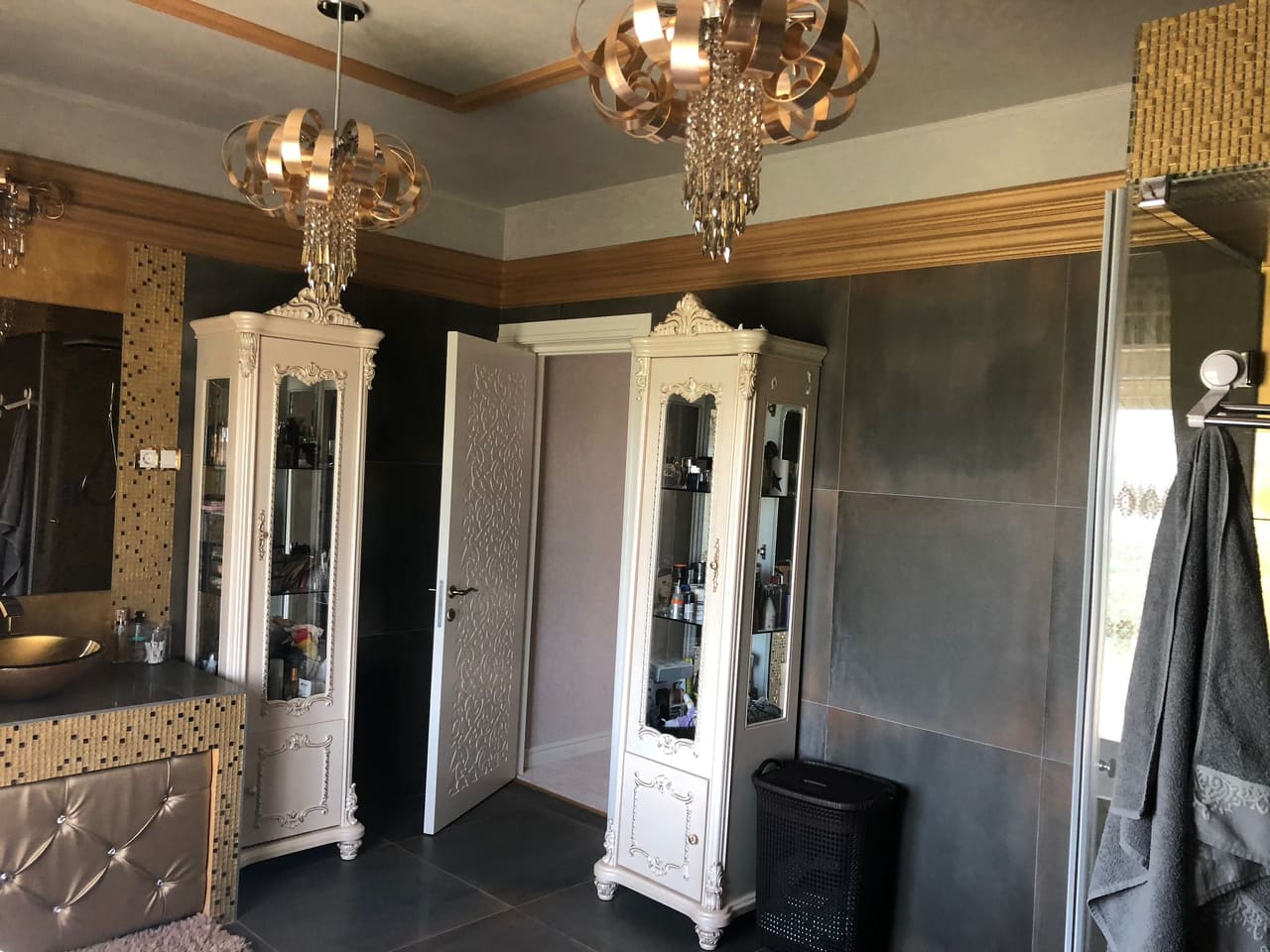 - Baie în stil glamour cu dus, 2 chiuvete, pisoar, bideu, wc, cadă aurie din acrilic