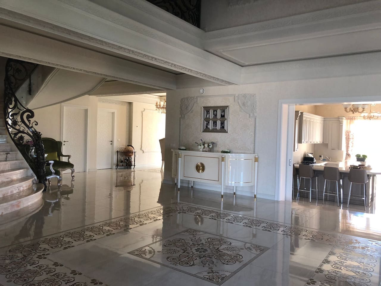 - Intrarea în casă impresionantă cu o înălțime de 7,2 m cu un candelabru măreț