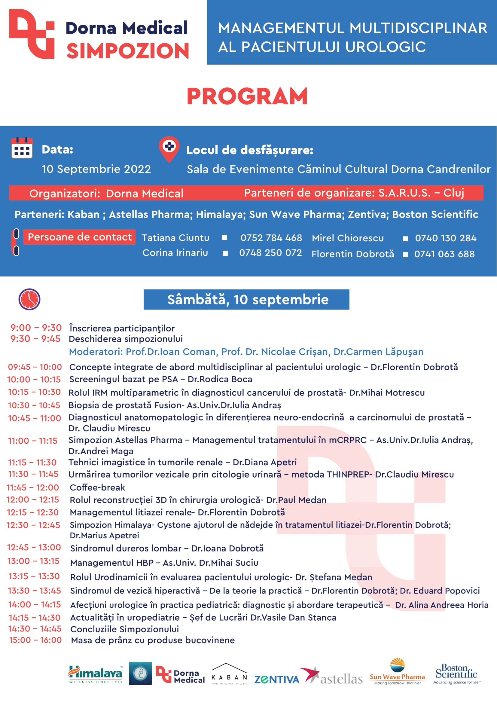 Dorna Medical ne-a oferit în toată activitatea sa medicală din 6 județe unde este prezentă, Suceava, Bistrița, Botoșani, Maramureș, Mureș și Iași, profesionalism și implicare în diagnosticare corectă și tratament adecvat, într-un cuvânt un management multidisciplinar al pacientului. Dovadă stă și simpozionul organizat sâmbătă , 10 septembrie, la Dorna Candreni. Locul de desfăşurare a manifestării ştiinţifice va fi Căminul Cultural Dorna Candrenilor, începând cu ora 9:00.