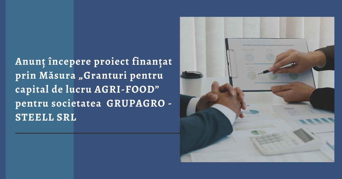 SC GRUPAGRO - STEELL SRL, cu sediul în Jud. Botoșani, Localitatea Viţcani, str. VIŢCANI, nr. 136, Str. Comunal, telefon: 0728563411, înregistrată sub nr. J7/65/2012 la oficiul Registrului Comerţului, CUI/CIF 29813761, anunta lansarea proiectul cu titlul ”Granturi pentru capital de lucru