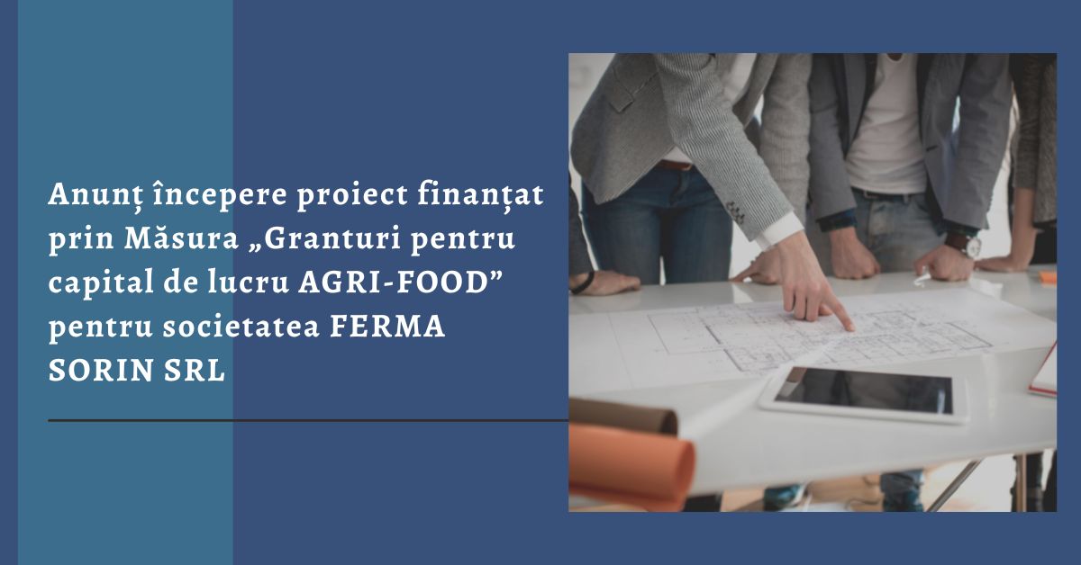 SC FERMA SORIN SRL, cu sediul în Jud. SUCEAVA, Localitatea Drăgoieşti, COM. DRĂGOIEŞTI, nr. 221 B, telefon: 0755755020, înregistrată sub nr. J33/1180/2005 la oficiul Registrului Comerţului, CUI/CIF RO17950463, anunta lansarea proiectul cu titlul ”Granturi pentru capital de lucru AGRI-FOOD” in