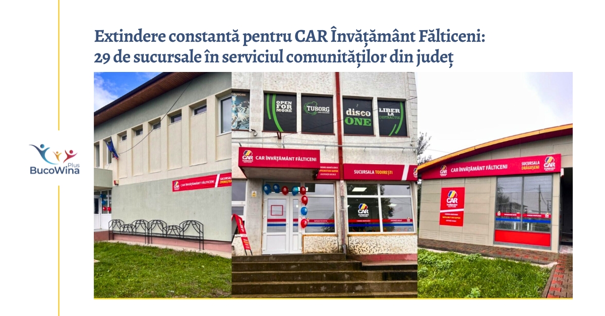 CAR Învățământ Fălticeni își continuă procesul de dezvoltare și consolidare la nivel județean, extinzându-și activitatea în Suceava prin deschiderea a trei noi sucursale, în localitățile Drăgușeni, Todirești și Zvoriștea. Odată cu aceste inaugurări, rețeaua instituției ajunge la 29 de puncte