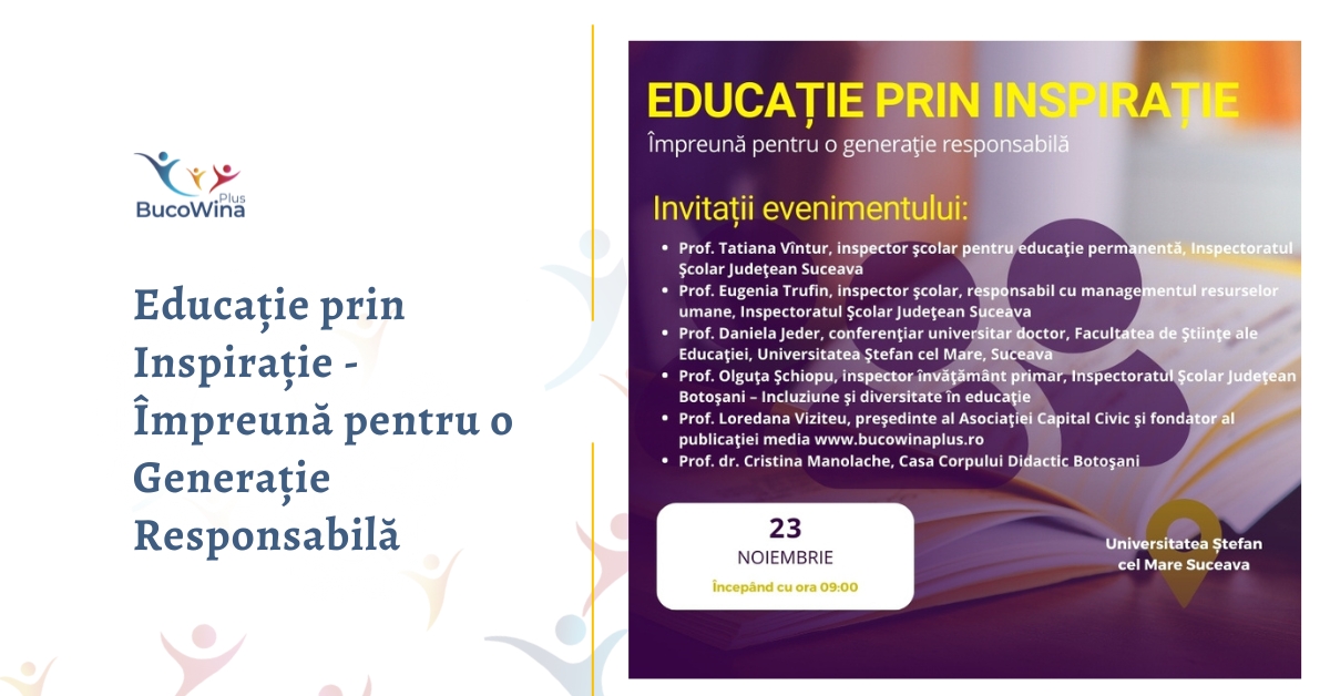 Asociația Capital Civic, prin proiectul "Oamenii Comunității – Dialog între Generații", organizează pe data de 23 noiembrie evenimentul ,,Educație prin Inspirație – Împreună pentru o Generație Responsabilă ''. La conferință vor fi invitați specialiști în educație care vor discuta despre