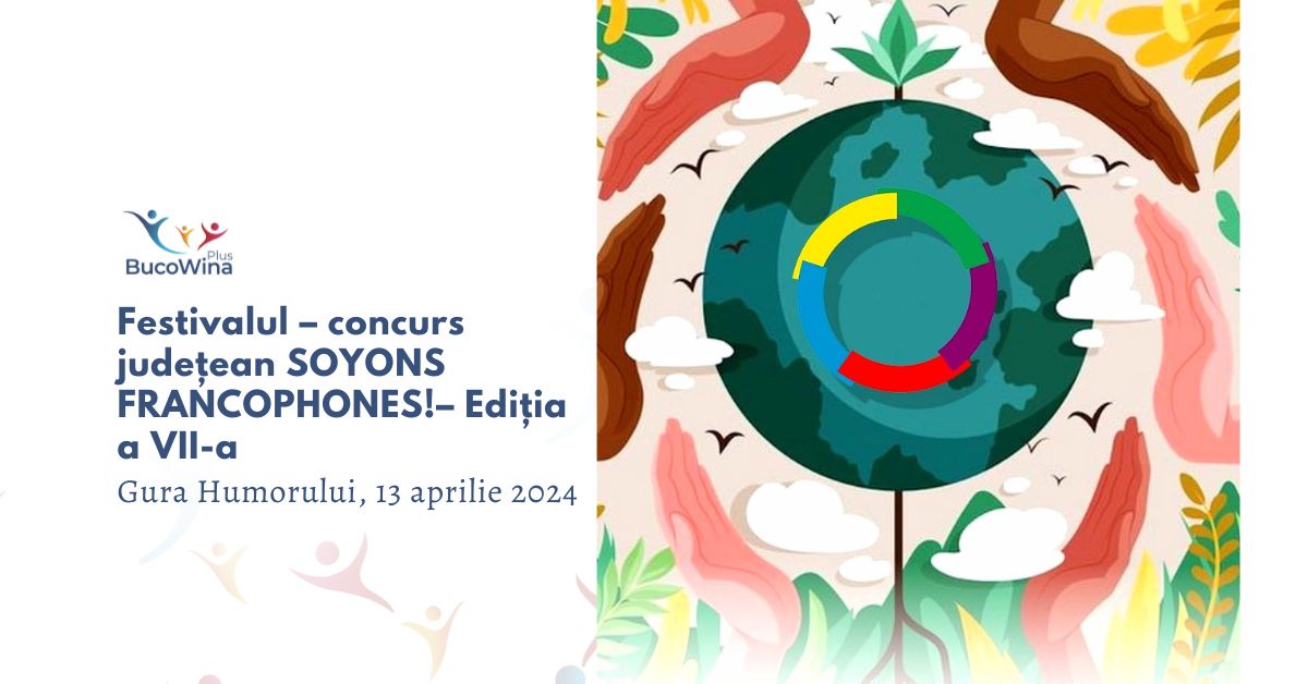 Avem bucuria de a vă informa că sâmbătă, 13 aprilie 2024, cu începere de la ora 9.00, la Centrul Cultural din Gura Humorului, va avea loc cea de-a VII-a ediția Festivalului - concurs județean SOYONS FRANCOPHONES!Festivalul-concurs județean SOYONS FRANCOPHONES! este iniţiat