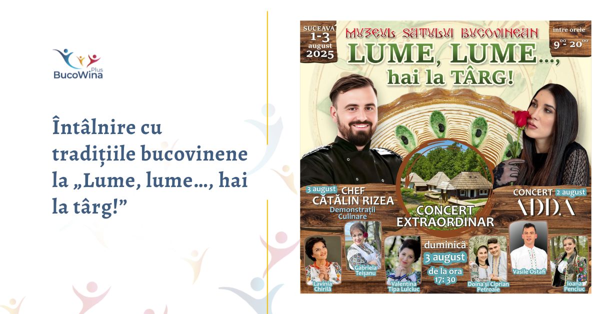 Muzeul Satului Bucovinean din Suceava va organiza, în perioada 1-3 august, o nouă ediție a festivalului „Lume, lume…, hai la târg!” Dacă vreți să ascultați muzică autentică, să cumpărați sau să admirați produse tradiționale și, de ce nu, să vă