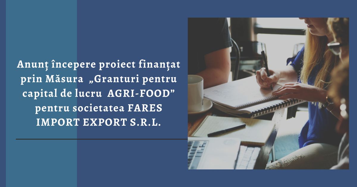 SC FARES IMPORT EXPORT S.R.L., cu sediul în Jud. SUCEAVA, localitatea Vatra-Dornei, Str. SCHITULUI, nr. 4, telefon: 0745123125, înregistrată sub nr. J33/1049/1994 la oficiul Registrului Comerţului, CUI/CIF 5910627 anunta lansarea proiectul cu titlul ” Granturi pentru capital de lucru AGRI-FOOD”