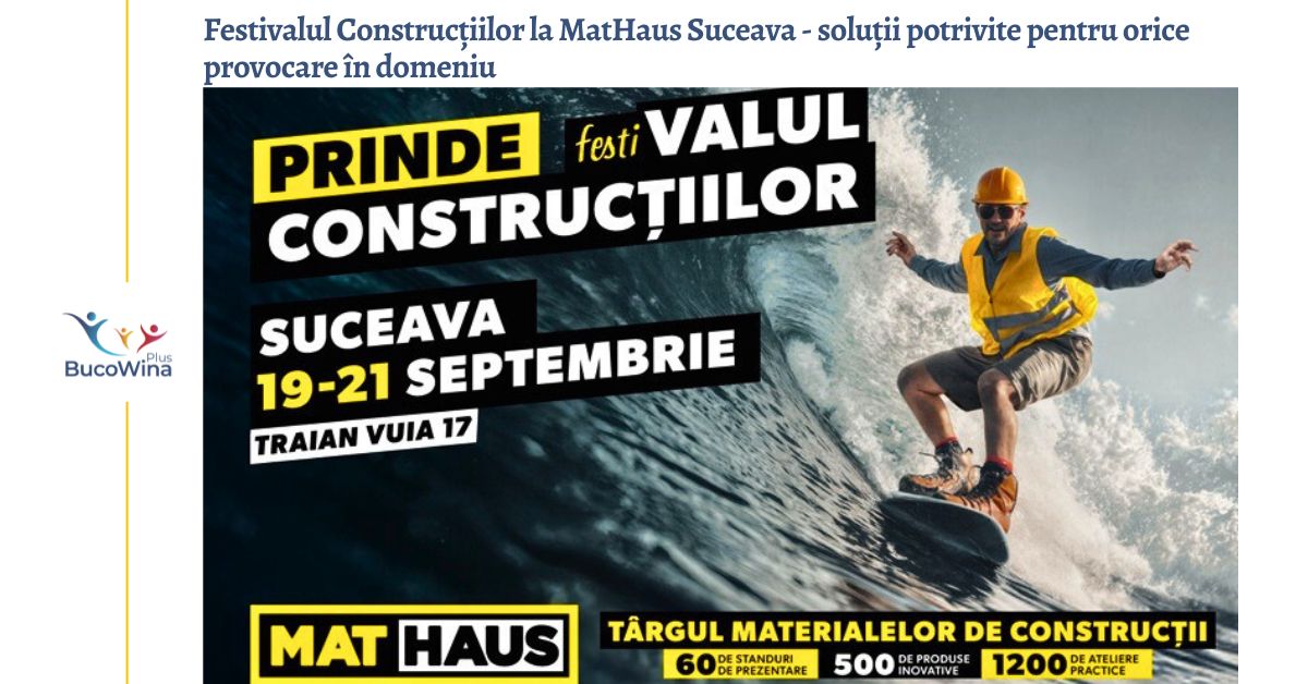 În perioada 19-21 septembrie, MatHaus Suceava organizează Festivalul Construcțiilor, eveniment de referință pentru industria construcțiilor, dedicat celor care doresc să descopere cele mai noi materiale, echipamente și soluții din domeniu. Locația de pe strada Traian Vuia nr. 17 se va